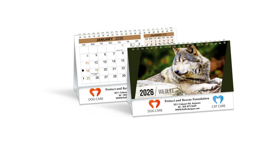 Desk calendar with year-at-a-glance, telephone index, notes. Wildlife theme.