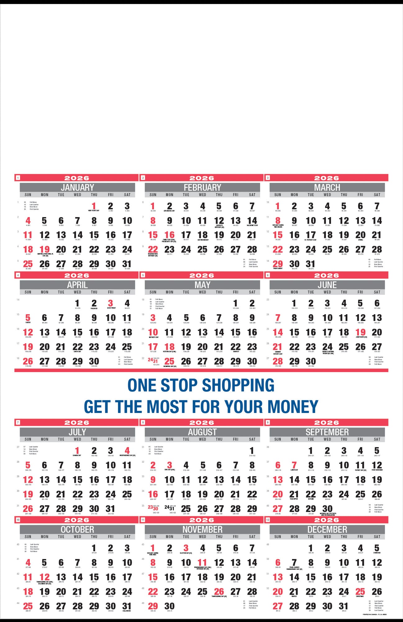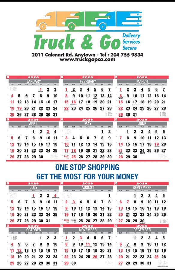 Large-format calendar visible from a distance, includes CA/US holidays.